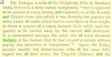The Badagas, a tribe of the Neilgherry Hills in Southern India, belieive in a deity named Gangamma, “who is supposed to be present at every stream, and especially so at the Koonde and Pykare rivers, into which it was formerly the practice for every owner of cattle, which had to cross them at their height, to throw a quarter of a rupee, because their cattle used frequently to be carried away by the current and destroyed. It is enumerated amongst the great sins of every deceased Badaga, at his funeral, that he had crossed a stream without paying due adoration to Gangamma.