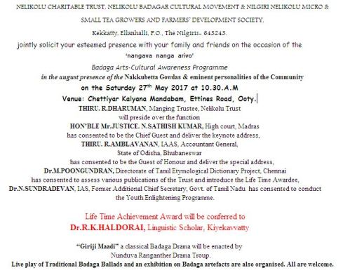 Nellikolu Charitable Trust, headed by Dharuman of Kekkatti, Yellanalli, who has been doing commendable work to make Badagas to know about themselves [Nangava Nanga Arivo – let us know about ourselves], is going to confer Life Time Achievement Award to Dr.R.Haldorai, author of many books on and of Badagas on the 27th May 2017 at Ooty.