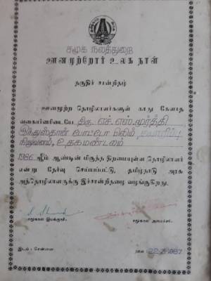 There after he joined HPF, Ooty and got prizes in the All India Public Sectors Sports for many years. While he was in HPF, he was selected as a best Industrial worker and got prize from then Governor of Tamil Nadu Sri. Kurana.