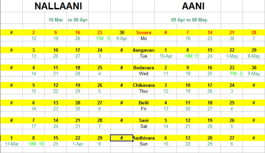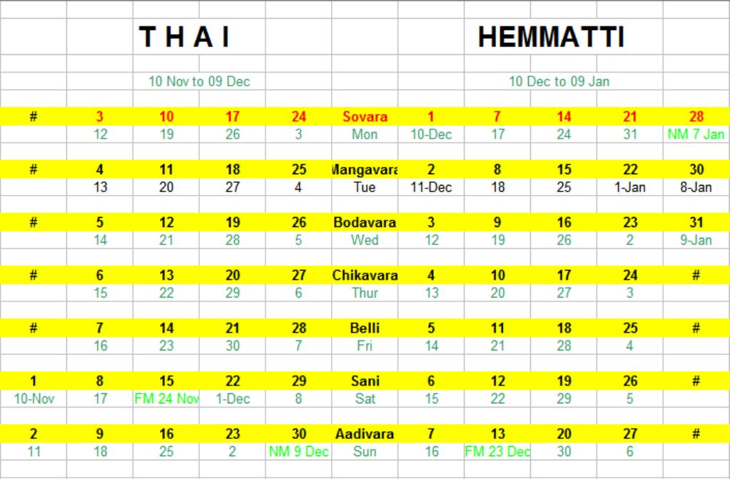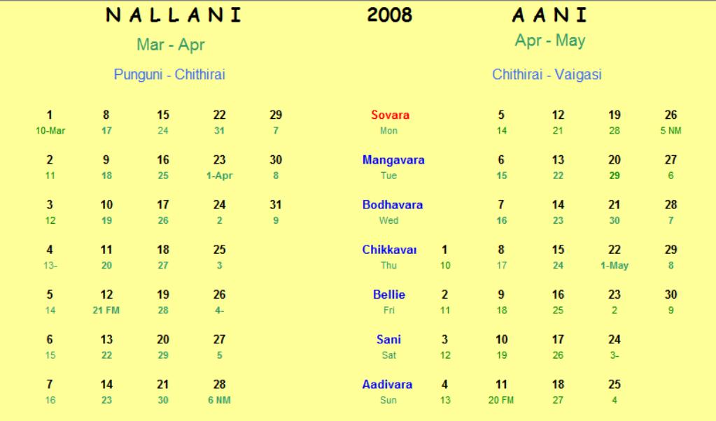 At the outset that the Badaga month begins always on a new moon day. For the Badagas the period between one new moon and the next new moon is a month. tinguva is the Badaga name for both moon and month and it expresses lunar month unequivocally, is roughly thirty days (Actually it consists 29. 5306 days). So, it is apparent that Badaga new year too begins on new moon day. It falls on different day every year because Badaga calendar is a lunisolar calendar. Every alternative year consists of thirteen new moon days . So one new moon day should be discarded without counting during every alternative year.