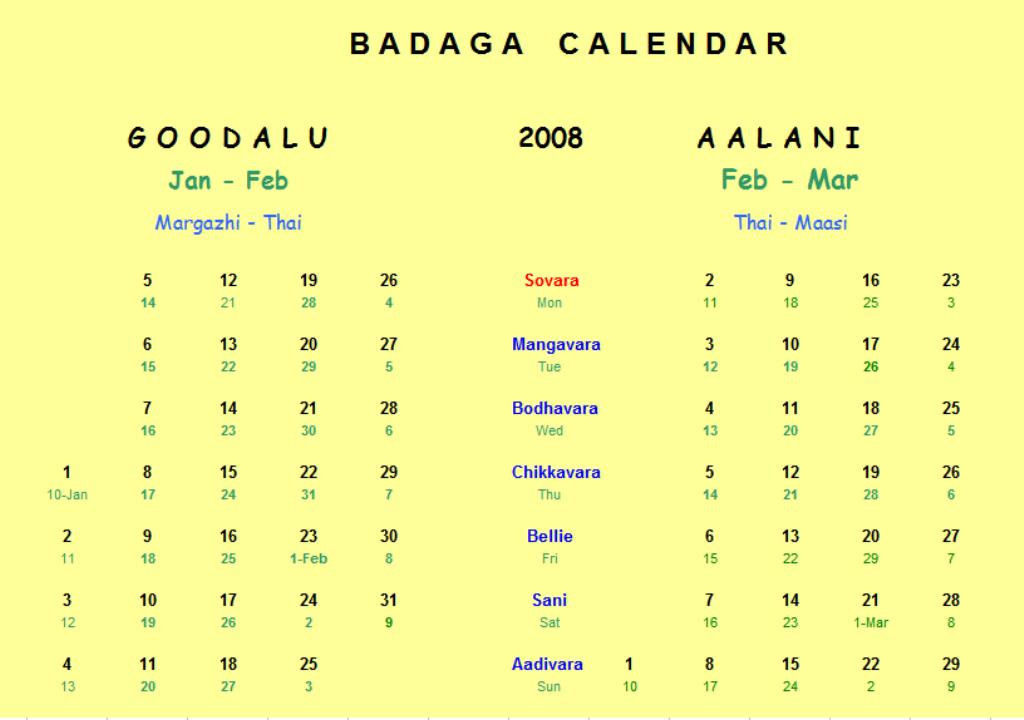 I have attempted to make the Badaga Calendars for 2007 and 2008 keeping in mind that a Badaga month should start on the 10th of an English month as far as possible and also to ensure that the number of days in a month is either 30 or 31 days.
