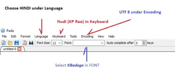 Choose the following Options from the drop down menu when you open Pada Software installed in the system. Language – Hindi, Keyboard – Nudi(KP.Rao), Encoding – UTF 8 & Font – KBadaga