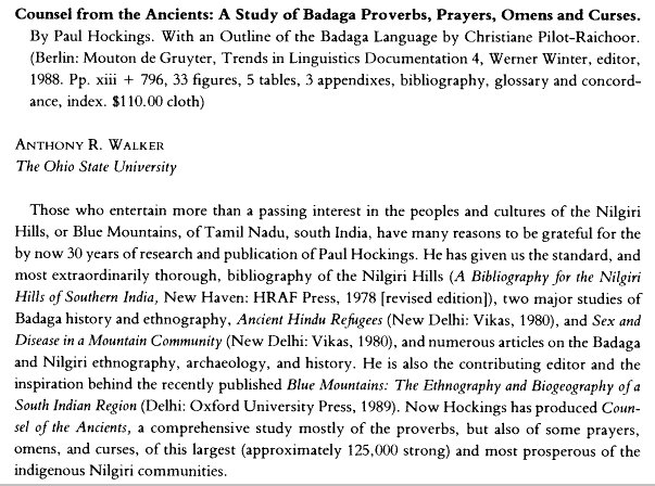 My first impressions, as I dig deep into Dr.P.Hockings books, are mixed. While one cannot but appreciate the efforts he has put into his works on Badaga, it is more of generalities that are made to look like facts; there are plenty of factual errors. May be his basic assumption that Badagas have migrated from Mysore mainly because the name BADAGA indicates that, could be wrong. I will write a full review of his bookssoon – JP [29th March,2008]